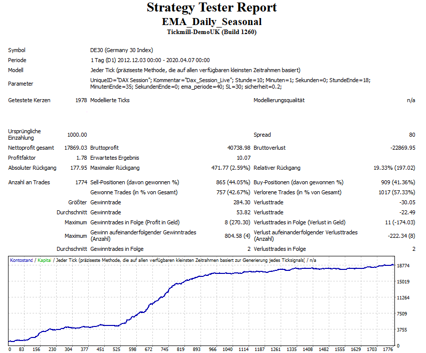 Notiert der DAX zur Handelseröffnung unterhalb unseres Trendfilters, gehen wir von einem Abwärtstrend, also einem Bärenmarkt aus. Wir wenden das gegenteilige Verhalten an: Am Montag, Donnerstag und Freitag shorten wir den Markt. Wogegen wir am Dienstag und Mittwoch long einsteigen. Wendet man diese einfache Regel auf die historischen Daten an, sollte man ein profitables und stabiles Handelssystem erhalten.